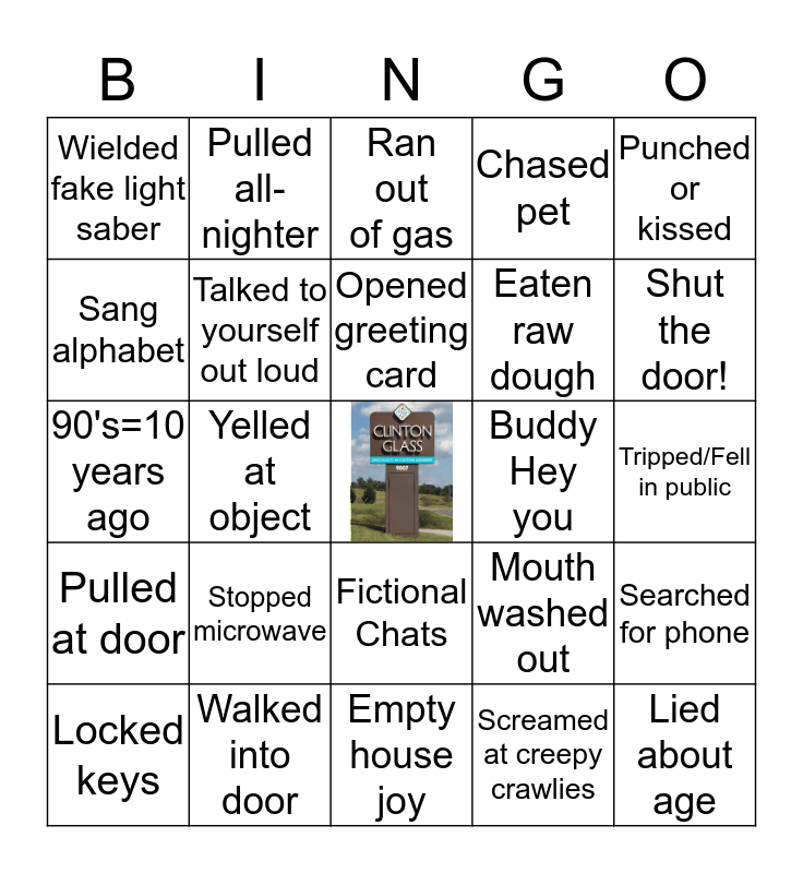 This bingo card has a free space and 43 words: Made faces, Lied about age, Spell Wed-nes-day, Locked keys, Wandered while phoning, Screamed at creepy crawlies, Ran out of gas, Called to the office, Punched or kissed, Walked into door, Chased pet, Buddy Hey you, Fictional Chats, Stopped microwave, Turned down music, Empty house joy, Bounced check, 90's=10 years ago, Gone to drive-in, Shut the door!, Pulled all-nighter, Forgotten name, Danced/ Sang in car, Wielded fake light saber, Waved to stranger, Tripped/Fell in public, Smiled and nodded, Retrieved box from trash, Mouth washed out, Pulled at door, Totalled a car, Searched for phone, Chatted with pet, Yelled at object, Wiped out skiiing, Set alarm earlier, Phone vibrated, Opened greeting card, Sang alphabet, Eaten raw dough, Swam after eating, Talked to yourself out loud and Thrown up/ fainted.