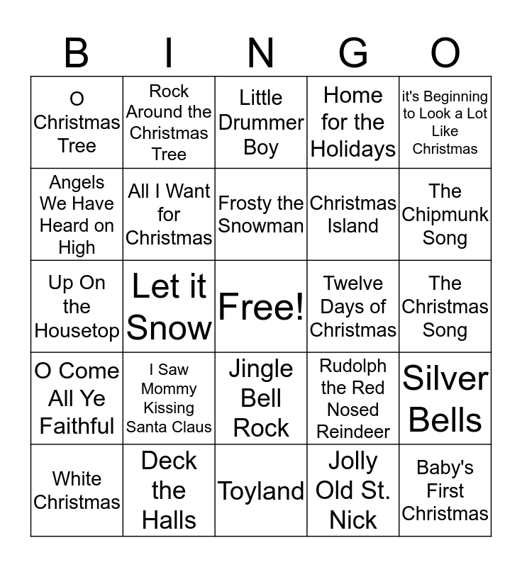This bingo card has a free space and 24 words: I Saw Mommy Kissing Santa Claus, Deck the Halls, Frosty the Snowman, White Christmas, it's Beginning to Look a Lot Like Christmas, O Christmas Tree, Angels We Have Heard on High, Rock Around the Christmas Tree, Twelve Days of Christmas, Jingle Bell Rock, Christmas Island, Up On the Housetop, Rudolph the Red Nosed Reindeer, Silver Bells, All I Want for Christmas, Jolly Old St. Nick, The Christmas Song, Little Drummer Boy, The Chipmunk Song, Let it Snow, Baby's First Christmas, O Come All Ye Faithful, Home for the Holidays and Toyland.