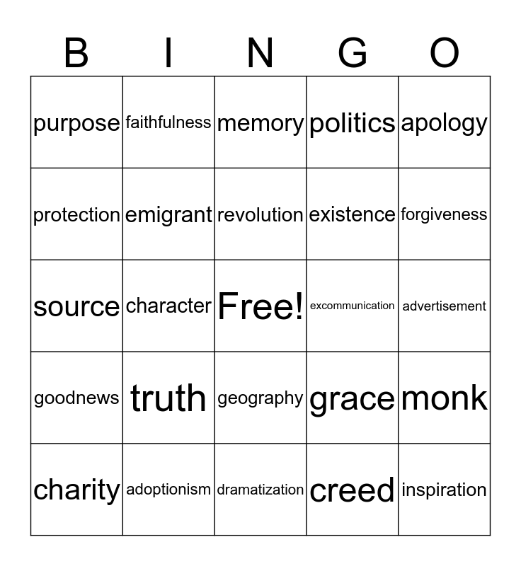 This bingo card has a free space and 50 words: canonization, inspiration, foundation, dramatization, truth, creation, faithfulness, sin, protection, covenant, emigrant, politics, monk, grace, denomination, choice, revolution, excommunication, confession, apology, character, creed, purpose, existence, conviction, sustainability, forgiveness, salvation, memory, geography, witness, promise, hypostatic union, docetism, adoptionism, eutychianism, translation, messiah, audience, advertisement, humanity, innocence, theology, behavior, charity, source, sacrifice, suffering, goodnews and judgement.