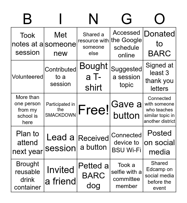 This bingo card has a free space and 24 words: Lead a session, Invited a friend, Bought a T-shirt, Brought reusable drink container, Donated to BARC, Took notes at a session, Volunteered, Met someone new, Gave a button, Received a button, Suggested a session topic, More than one person from my school is here, Connected device to BSU Wi-Fi, Posted on social media, Contributed to a session, Took a selfie with a committee member, Connected with someone who teaches similar topic in another district, Shared a resource with someone else, Signed at least 3 thank you letters, Participated in the SMACKDOWN, Shared Edcamp on social media before the event, Plan to attend next year, Accessed the Google schedule online and Petted a BARC dog.
