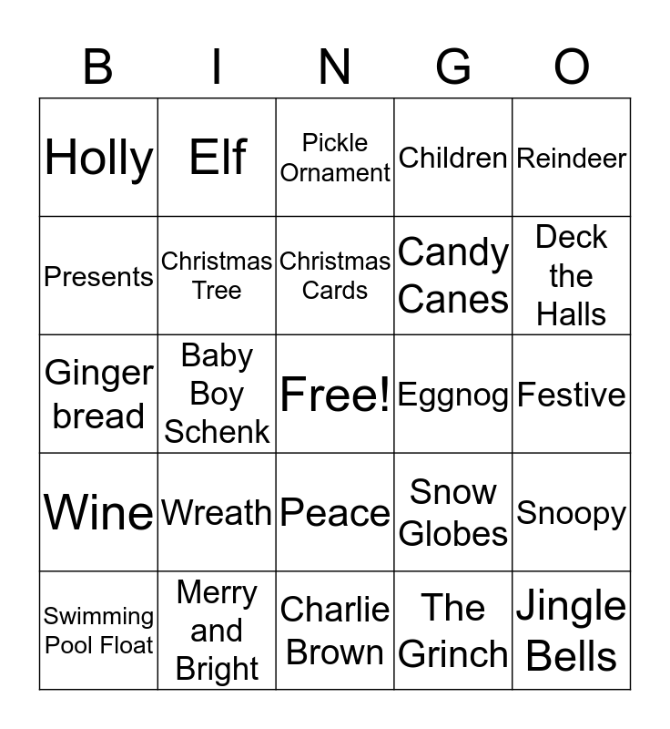 This bingo card has a free space and 29 words: Swimming Pool Float, Wedding!, Baby Boy Schenk, Reindeer, Holly, Pickle Ornament, Christmas Tree, Wreath, Eggnog, Merry and Bright, Festive, Jingle Bells, Charlie Brown, The Grinch, Deck the Halls, Twinkling Lights, Peace, Wine, Reindeer, Ginger bread, Snow Globes, Cookies, Candy Canes, Presents, Children, Elf, Snoopy, Christmas Cards and Christmas Carols.
