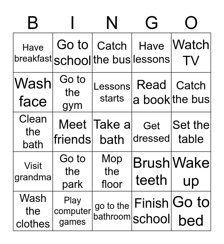 This bingo card has 50 words: Come home, Take a bath, Get up, go to the bathroom, Go to the park, Have lunch, Go to school, Do exercises, Wash face, Have dinner, Go to the gym, Have lessons, Wake up, Brush teeth, Help with chores, Do homework, Lessons starts, Get dressed, Take a shower, Watch TV, Meet friends, Finish school, Have breakfast, Read a book, Play games, Go to bed, Catch the bus, Buy fruits, Catch the bus, Mop the floor, Get undressed, Listen to music, Drive a car, Dry plates, Play computer games, Make the bed, Wash the dishes, Do the ironing, Vacuum the carpet, Set the table, Make the bed, Water the plants, Feed a pet, Cook the dinner, Wash the clothes, Clean the bath, Go to the library, Go to the post office, Visit grandma and Visit grandpa.