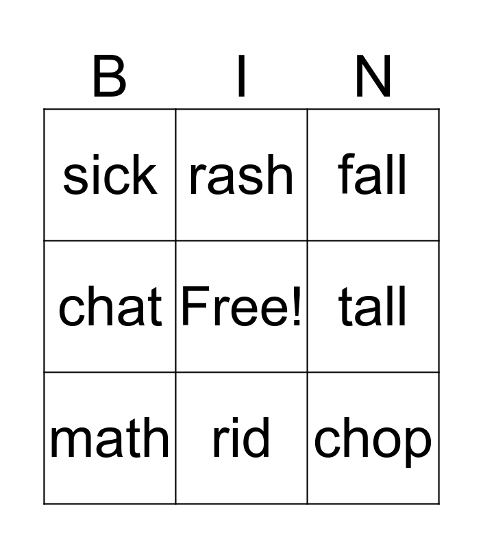 This bingo card has a free space and 8 words: tall, fall, rash, math, sick, chop, chat and rid.