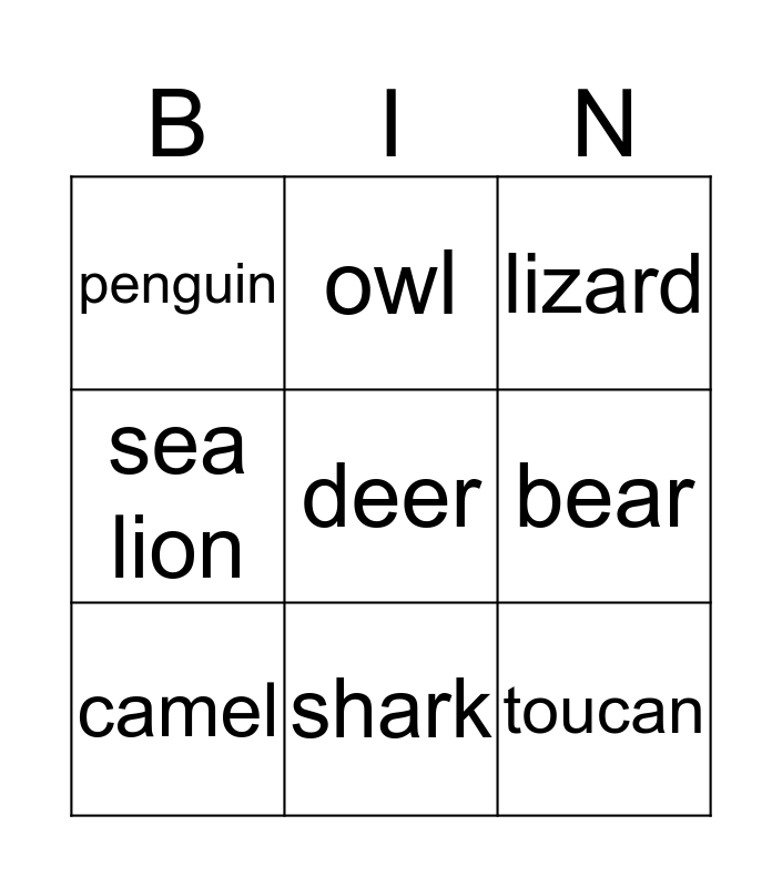 This bingo card has a free space and 8 words: bear, lizard, owl, camel, penguin, toucan, sea lion and shark.
