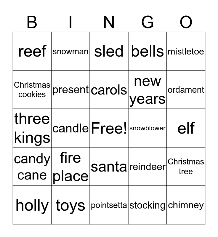 This bingo card has a free space and 24 words: fire place, toys, carols, holly, mistletoe, reef, Christmas cookies, snowman, snowblower, santa, new years, three kings, reindeer, Christmas tree, present, stocking, elf, sled, ordament, candle, chimney, candy cane, bells and pointsetta.