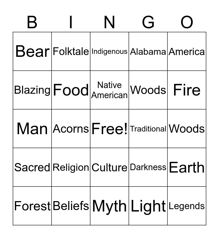 This bingo card has a free space and 24 words: Religion, Beliefs, Native American, Forest, America, Bear, Blazing, Folktale, Traditional, Culture, Woods, Man, Darkness, Earth, Food, Light, Woods, Indigenous, Fire, Acorns, Legends, Sacred, Alabama and Myth.
