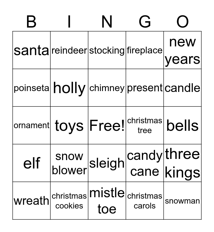This bingo card has a free space and 24 words: wreath, snow blower, chimney, christmas carols, new years, santa, reindeer, stocking, christmas tree, bells, ornament, holly, candy cane, three kings, poinseta, christmas cookies, mistle toe, fireplace, candle, elf, toys, sleigh, present and snowman.