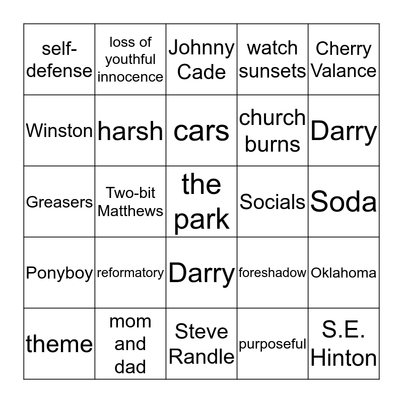 This bingo card has 25 words: Ponyboy, mom and dad, the park, purposeful, Cherry Valance, self-defense, loss of youthful innocence, Johnny Cade, Socials, Oklahoma, Winston, harsh, Steve Randle, foreshadow, Darry, theme, Two-bit Matthews, cars, church burns, Soda, Greasers, reformatory, Darry, watch sunsets and S.E. Hinton.