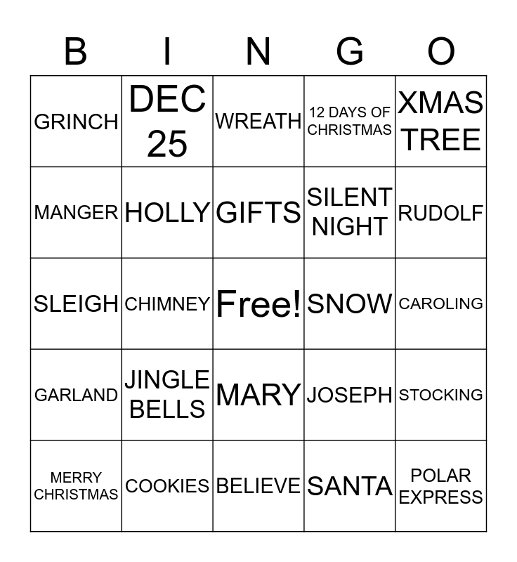 This bingo card has a free space and 34 words: REINDEER, SANTA, ELVES, SNOWMAN, GARLAND, HOLLY, XMAS TREE, MERRY CHRISTMAS, DEC 25, JESUS, GIFTS, WREATH, XMAS BULBS, 3 WISE MEN, SNOW, RUDOLF, COOKIES, SLEIGH, JINGLE BELLS, JOSEPH, MARY, GIFTS, GRINCH, CAROLING, BELIEVE, POLAR EXPRESS, 12 DAYS OF CHRISTMAS, PARTRIDGE IN A PEAR TREE, SILENT NIGHT, MANGER, MISTLE TOE, CHIMNEY, STOCKING and NATIVITY.