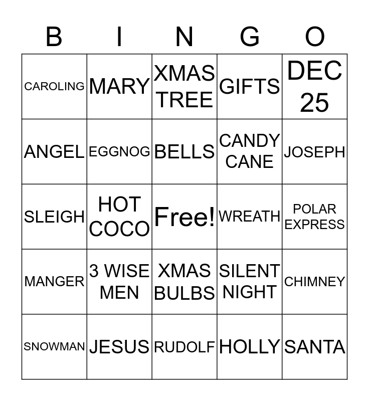 This bingo card has a free space and 44 words: REINDEER, SANTA, ELVES, SNOWMAN, GARLAND, HOLLY, XMAS TREE, MERRY CHRISTMAS, DEC 25, JESUS, GIFTS, WREATH, XMAS BULBS, 3 WISE MEN, SNOW, RUDOLF, COOKIES, SLEIGH, JINGLE BELLS, JOSEPH, MARY, GIFTS, GRINCH, CAROLING, BELIEVE, POLAR EXPRESS, 12 DAYS OF CHRISTMAS, PARTRIDGE IN A PEAR TREE, SILENT NIGHT, MANGER, MISTLE TOE, CHIMNEY, STOCKING, NATIVITY, HOT COCO, TOYS, HOLIDAY, PARTY PARTY PARTY, BELLS, ANGEL, CANDY CANE, GINGER BREAD, EGGNOG and DECORATIONS.