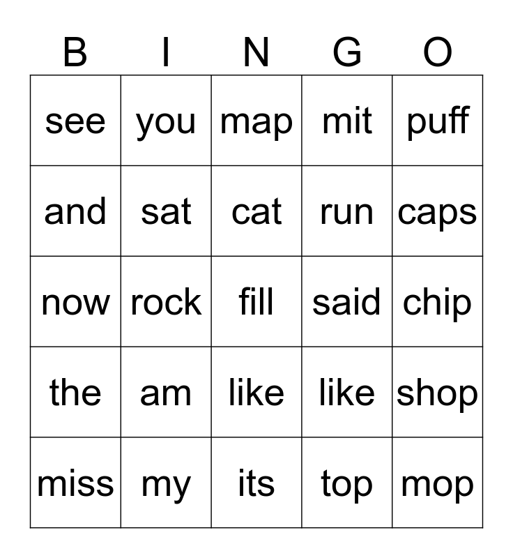 This bingo card has 25 words: am, its, cat, miss, puff, see, and, you, said, like, run, now, like, shop, sat, mop, chip, map, caps, rock, fill, my, the, mit and top.