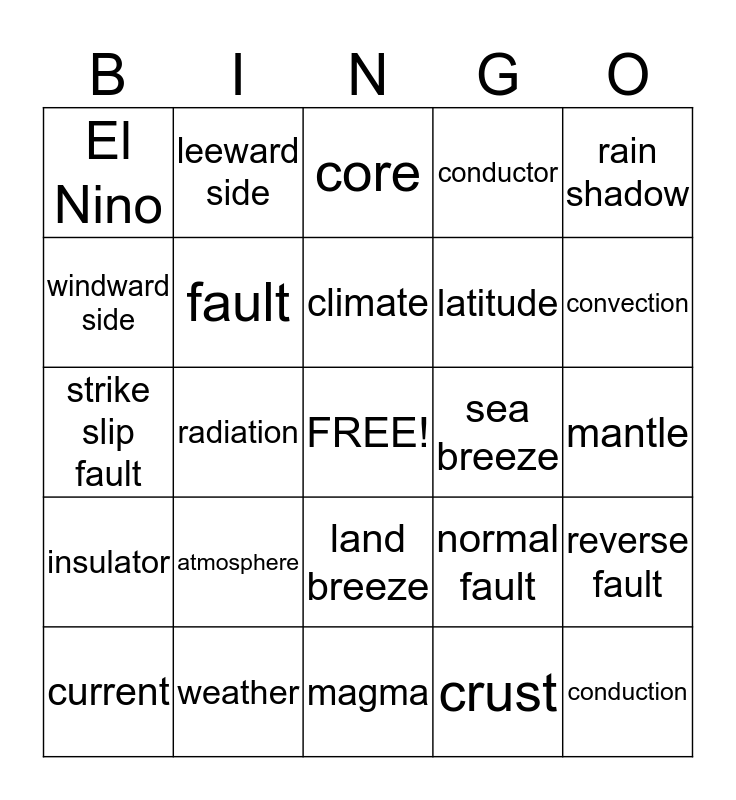 This bingo card has a free space and 24 words: atmosphere, weather, climate, current, rain shadow, El Nino, windward side, leeward side, sea breeze, land breeze, latitude, strike slip fault, normal fault, reverse fault, fault, crust, mantle, core, convection, radiation, conduction, insulator, conductor and magma.
