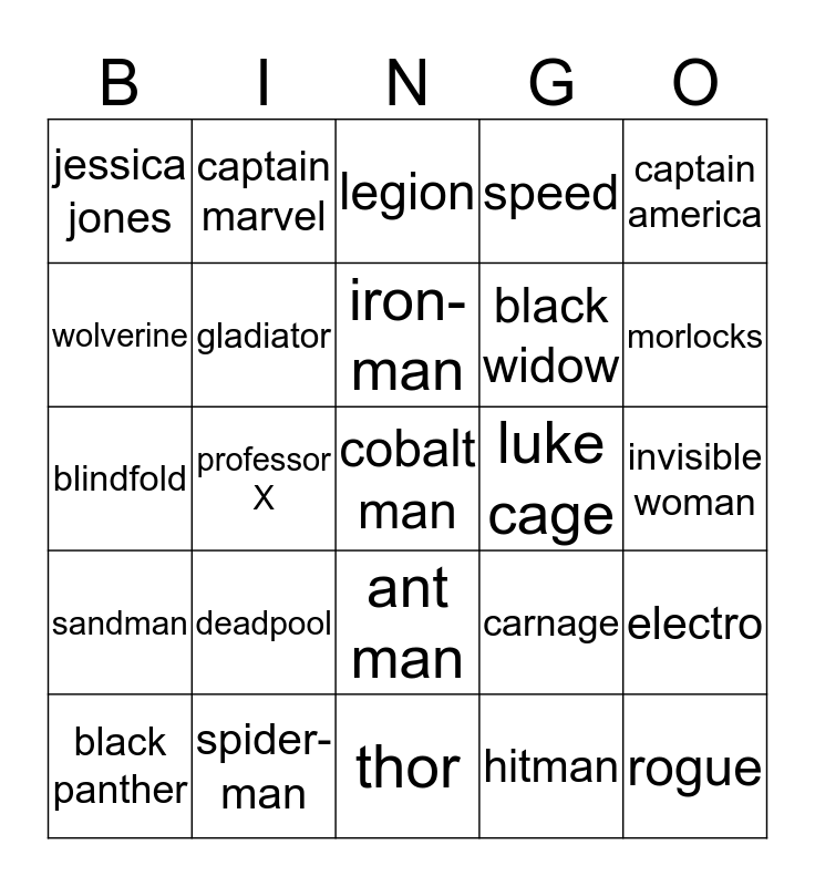 This bingo card has a free space and 24 words: deadpool, spider-man, iron-man, black panther, captain america, jessica jones, wolverine, captain marvel, luke cage, ant man, black widow, blindfold, carnage, electro, gladiator, hitman, invisible woman, legion, morlocks, professor X, rogue, sandman, speed and thor.