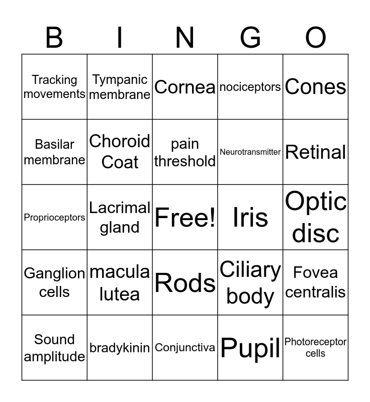 This bingo card has a free space and 31 words: Conjunctiva, Conjunctiva, Lacrimal gland, Saccades, Tracking movements, Cornea, Choroid Coat, Ciliary body, Iris, Pupil, Optic disc, Photoreceptor cells, Posterior segment, Anterior segment, Retinal, Rhodopsin, Fovea centralis, macula lutea, Ganglion cells, Rods, Cones, Sound frequency, Sound amplitude, Tympanic membrane, Neurotransmitter, Basilar membrane, nociceptors, Proprioceptors, bradykinin, pain threshold and pain tolerance.