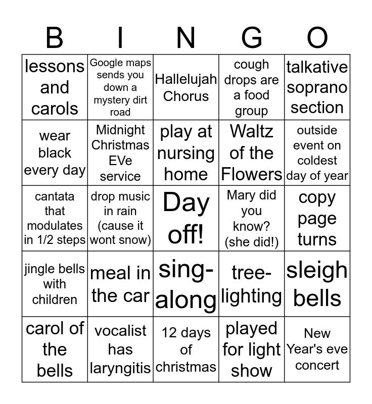 This bingo card has a free space and 24 words: meal in the car, vocalist has laryngitis, play at nursing home, carol of the bells, talkative soprano section, lessons and carols, wear black every day, Google maps sends you down a mystery dirt road, Mary did you know? (she did!), sing-along, Waltz of the Flowers, cantata that modulates in 1/2 steps, tree-lighting, sleigh bells, Midnight Christmas EVe service, played for light show, copy page turns, Hallelujah Chorus, outside event on coldest day of year, drop music in rain (cause it wont snow), New Year's eve concert, jingle bells with children, cough drops are a food group and 12 days of christmas.