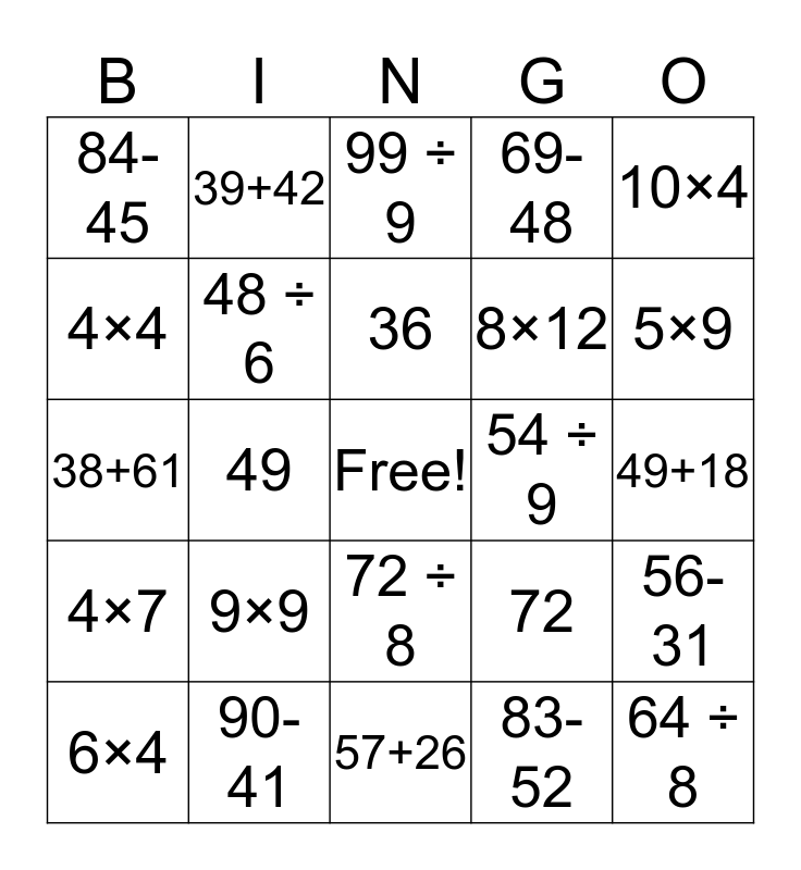 This bingo card has a free space and 34 words: 7×12, 83-52, 18 ÷ 6, 25+19, 4×7, 48 ÷ 6, 10×4, 6×4, 39+42, 47, 36, 99 ÷ 9, 8×7, 35 ÷ 7, 54 ÷ 9, 5×9, 90-41, 38+61, 9×9, 72, 72 ÷ 8, 11×11, 84-45, 49+18, 57+26, 64 ÷ 8, 69-48, 6×11, 8×12, 4×4, 10×11, 49, 56-31 and 68.