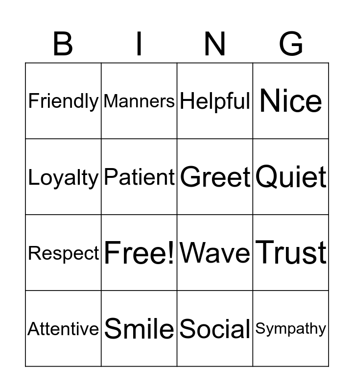 This bingo card has 20 words: Trust, Space, Helpful, Polite, Attentive, Loyalty, Smile, Friendly, Respect, Manners, Free!, Wave, Patient, Sympathy, Greet, Neighbor, Quiet, Nice, Social and Healthy.