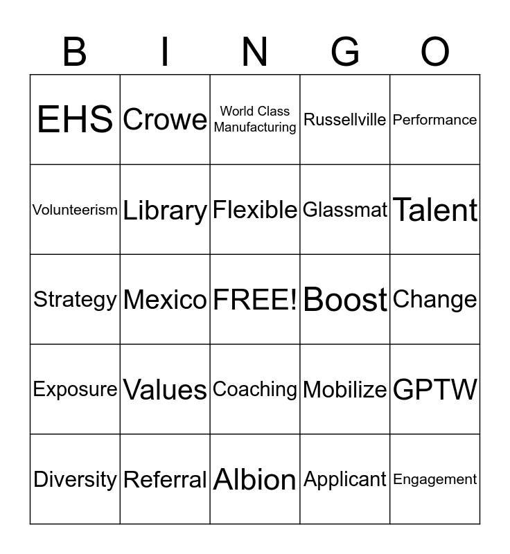 This bingo card has a free space and 71 words: Nutson, Crowe, Watkins, Delegation, Albion, Midland, Russellville, Charleston, Glassmat, Recruitment, Diversity, Rewards, Talent, EHS, Mission, Strategy, Mobilize, Performance, Development, Change, Values, Engagement, GPTW, Future, Employee, Onboarding, Interview, Open Jobs, Workforce, Planning, Referral, Initiative, Candidate, Resume, Applicant, You Are, Goals, Mentoring, Volunteerism, Feedback, Coaching, Experience, Exposure, Education, Networking, Leadership, Essentials, Library, Confidential, ADFORS, Saint-Gobain, ILearn, Boost, SGNA, University, Survey, Flexible, Heather, Donna, Kathy, Melanie, Headcount, Mexico, US, Canada, WCM, World Class Manufacturing, Policy, HR, Project and Livewell.