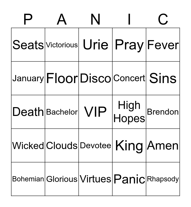 This bingo card has a free space and 24 words: Clouds, Glorious, Disco, Bohemian, Fever, Seats, January, Victorious, High Hopes, Devotee, Concert, Death, King, Amen, Floor, Panic, Brendon, Urie, Sins, Bachelor, Rhapsody, Wicked, Pray and Virtues.