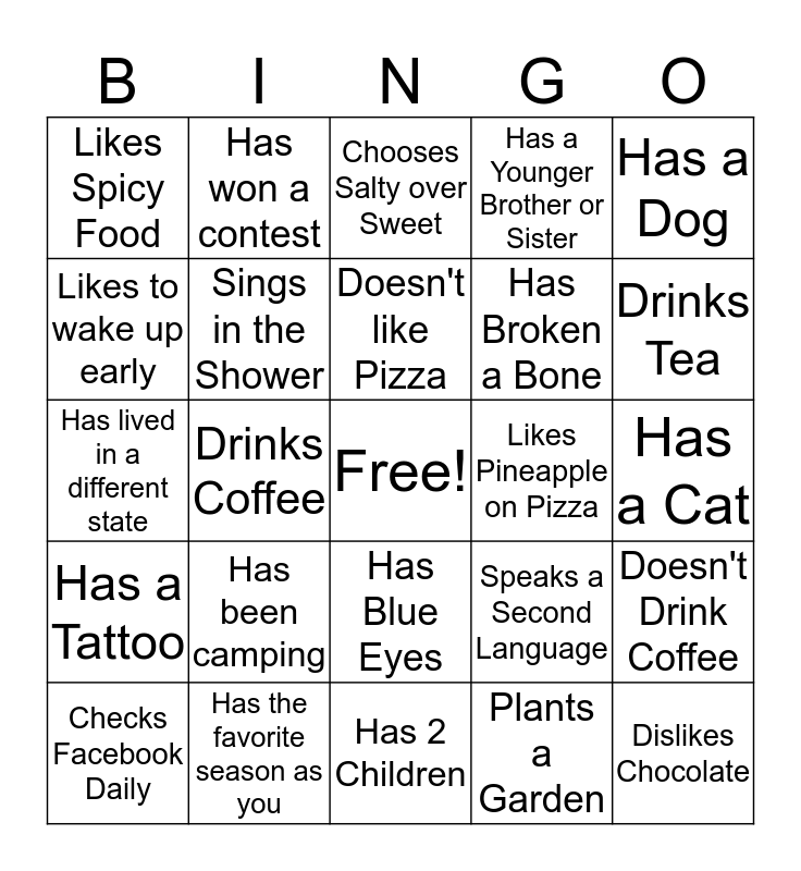 This bingo card has a free space and 29 words: Checks Facebook Daily, Prefers Coke over Pepsi, Drinks Coffee, Drives a Red Car, Likes Spicy Food, Chooses Salty over Sweet, Sings in the Shower, Has been camping, Likes Pineapple on Pizza, Has the favorite season as you, Has a Cat, Dislikes Chocolate, Has 2 Children, Plants a Garden, Drinks Tea, Likes to Bake, Has Blue Eyes, Has a Tattoo, Has a Dog, Has lived in a different state, Speaks a Second Language, Can play a musical Instrument, Has Broken a Bone, Likes to wake up early, Has a Younger Brother or Sister, Has won a contest, Doesn't Drink Coffee, Doesn't like Pizza and Wears contacts.