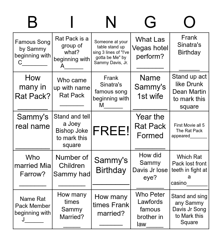 This bingo card has a free space and 24 words: Number of Children Sammy had _______, How many times Sammy Married?_____, Frank Sinatra's famous song beginning with M______, Name Rat Pack Member beginning with J______, Frank Sinatra's Birthday ______, Famous Song by Sammy beginning with C________, How many in Rat Pack? _______, Rat Pack is a group of what? beginning with A______, Year the Rat Pack Formed _______, Sammy's Birthday ________, Name Sammy's 1st wife ________, Sammy's real name ________, How did Sammy Davis Jr lose eye? ________, Which Rat Pack lost front teeth in fight at a casino_______, Who came up with name Rat Pack _______, Who Peter Lawfords famous brother in law_____, First Movie all 5 The Rat Pack appeared_______, Someone at your table stand up sing 3 lines of "I've gotta be Me" by Sammy Davis, Jr., Stand up act like Drunk Dean Martin to mark this square, Stand and tell a Joey Bishop Joke to mark this square, Stand and sing any Sammy Davis Jr Song to Mark this Square, Who married Mia Farrow? _______, What Las Vegas hotel perform? _______ and How many times Frank married? ______.