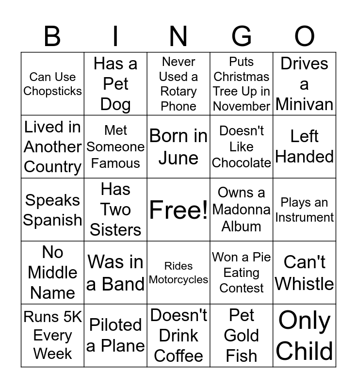 This bingo card has a free space and 24 words: Was in a Band, Piloted a Plane, Born in June, Runs 5K Every Week, Drives a Minivan, Can Use Chopsticks, Lived in Another Country, Has a Pet Dog, Owns a Madonna Album, Rides Motorcycles, Doesn't Like Chocolate, Speaks Spanish, Won a Pie Eating Contest, Can't Whistle, Met Someone Famous, Pet Gold Fish, Plays an Instrument, Never Used a Rotary Phone, Left Handed, Has Two Sisters, Only Child, No Middle Name, Puts Christmas Tree Up in November and Doesn't Drink Coffee.