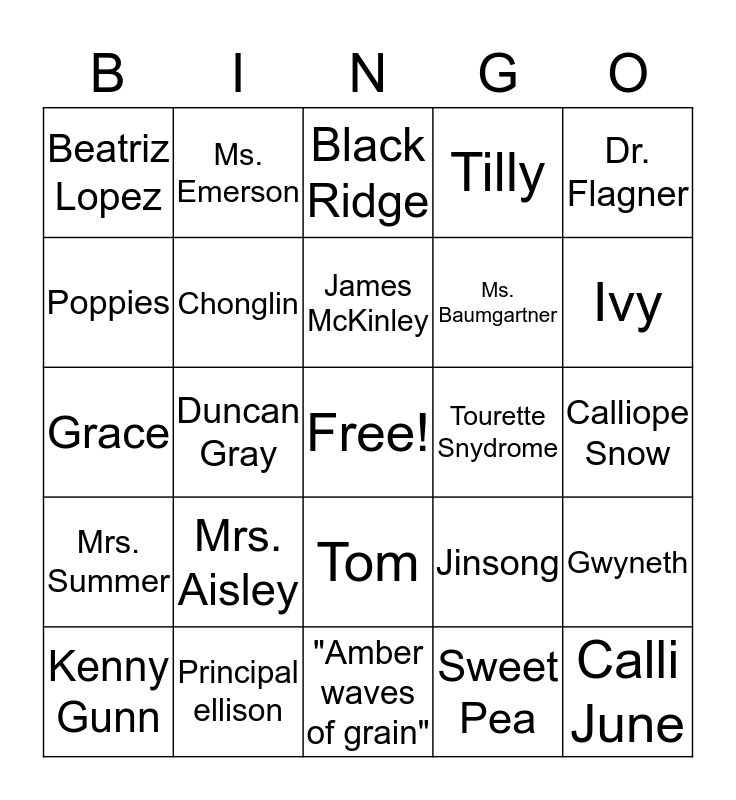 This bingo card has a free space and 31 words: "Amber waves of grain", Coach Todd, Duncan Gray, Niles Jacques, Beatriz Lopez, Black Ridge, Chonglin, Jinsong, Tourette Snydrome, Sweet Pea, Calliope Snow, Calli June, Rosamelia's Flower Shop, Mr. Kahn, Ivy, Hazel, Gwyneth, Mrs. Aisley, Mrs. Summer, Tom, Dr. Flagner, Mrs. Locke, Kenny Gunn, Ms. Emerson, Ms. Baumgartner, Poppies, Tilly, Grace, Principal ellison, James McKinley and panetoi.