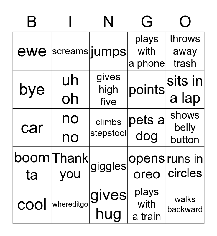This bingo card has a free space and 39 words: ball, ma, claps, opens oreo, runs in circles, boom ta, no no, climbs on couch, pets a dog, shows belly button, bye, screams, plays peek a boo, sits in a lap, car, Thank you, giggles, plays with a phone, surprise face, cool, uh oh, gives high five, plays with a train, throws away trash, doggie, whereditgo, gives hug, plays with a truck, throws a ball, ewe, wow, gives kiss, points, walks backward, jibber jabber, yum, jumps, runs and wears sunglasses.
