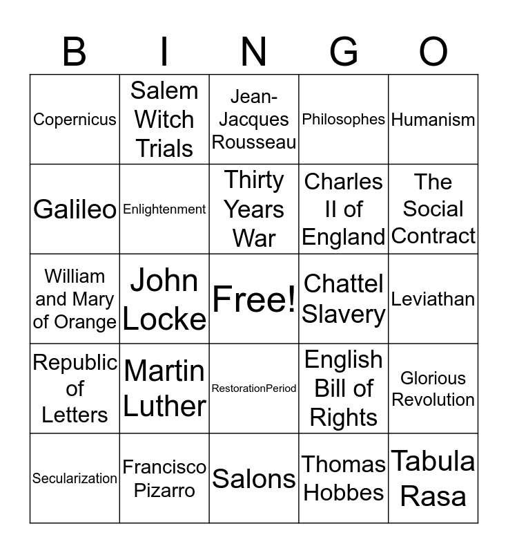 This bingo card has a free space and 24 words: Martin Luther, Francisco Pizarro, Thirty Years War, Secularization, Humanism, Copernicus, Galileo, Salem Witch Trials, Chattel Slavery, RestorationPeriod, Charles II of England, William and Mary of Orange, English Bill of Rights, Glorious Revolution, Enlightenment, Thomas Hobbes, Leviathan, Jean-Jacques Rousseau, The Social Contract, John Locke, Tabula Rasa, Republic of Letters, Philosophes and Salons.