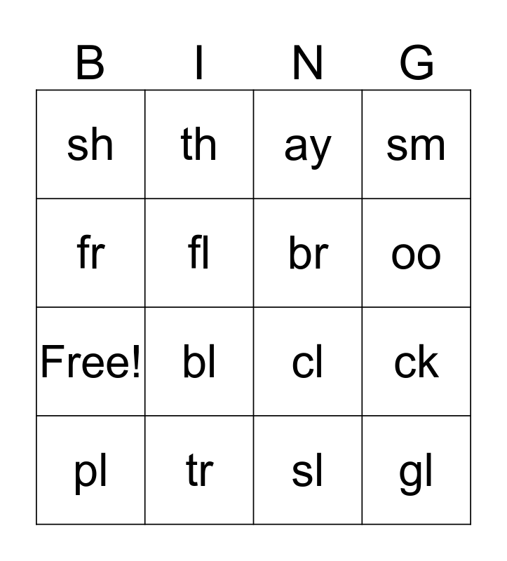This bingo card has 20 words: ck, y, ay, st, pl, fr, tr, sh, Free!, th, bl, cl, fl, gl, br, dr, oo, sm, sl and sn.
