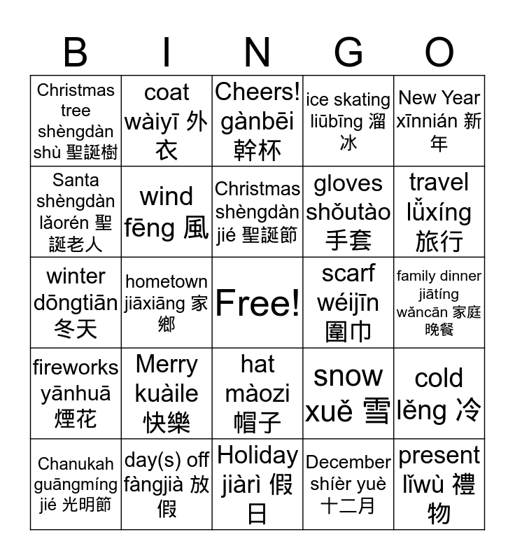 This bingo card has a free space and 25 words: Merry kuàile 快樂, Holiday jiàrì 假日, Christmas shèngdàn jié 聖誕節, Chanukah guāngmíng jié 光明節, New Year xīnnián 新年, Christmas tree shèngdàn shù 聖誕樹, Santa shèngdàn lǎorén 聖誕老人, coat wàiyī 外衣, scarf wéijīn 圍巾, hat màozi 帽子, gloves shǒutào 手套, winter dōngtiān 冬天, snow xuě 雪, cold lěng 冷, wind fēng 風, ice bīng 冰, family dinner jiātíng wǎncān 家庭晚餐, Cheers! gànbēi 幹杯, travel lǚxíng 旅行, hometown jiāxiāng 家鄉, present lǐwù 禮物, day(s) off fàngjià 放假, fireworks yānhuā 煙花, ice skating liūbīng 溜冰 and December shíèr yuè 十二月.