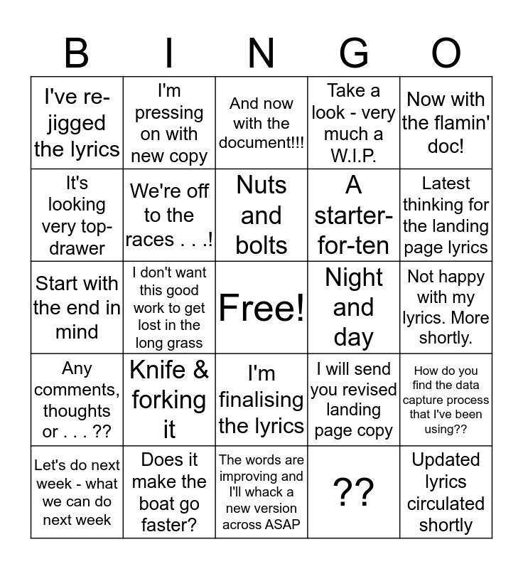 This bingo card has a free space and 24 words: Knife & forking it, Does it make the boat go faster?, Nuts and bolts, Let's do next week - what we can do next week, Now with the flamin' doc!, I've re-jigged the lyrics, It's looking very top-drawer, I'm pressing on with new copy, Night and day, I'm finalising the lyrics, A starter-for-ten, Start with the end in mind, I will send you revised landing page copy, How do you find the data capture process that I've been using??, We're off to the races . . .!, ??, Not happy with my lyrics. More shortly., And now with the document!!!, Latest thinking for the landing page lyrics, I don't want this good work to get lost in the long grass, Updated lyrics circulated shortly, Any comments, thoughts or . . . ??, Take a look - very much a W.I.P. and The words are improving and I'll whack a new version across ASAP.