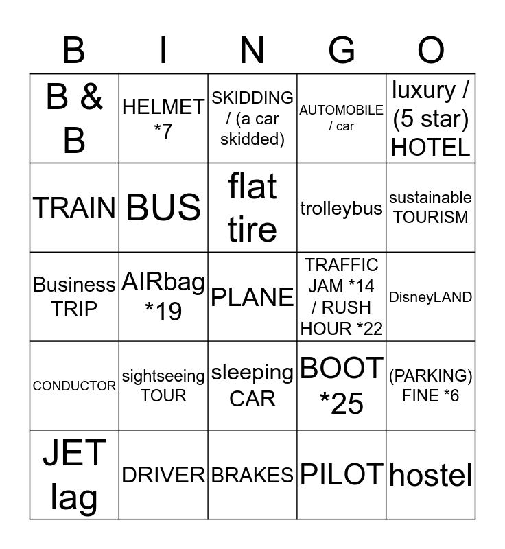 This bingo card has a free space and 59 words: FLIGHT ATTENDANT *1, DRIVER, PEDESTRIAN *5, CONDUCTOR, PILOT, BICYCLE, BUS, TRAM *11, trolleybus, metro / subway, AUTOMOBILE / car, COACH *2, TRAIN, CRUISE SHIP, INN, B & B, hostel, luxury / (5 star) HOTEL, green TOURISM, flat tire, TRAFFIC JAM *14 / RUSH HOUR *22, SKIDDING / (a car skidded), JET lag, (PARKING) FINE *6, DELTA, FERRY / boat, MOTEL, eco TOURISM, sustainable TOURISM, ROUNDABOUT *8, BICYCLE LANE *13, PAVEMENT, taxi / cab, POTholes, HELMET *7, VISA *9, LIFE JACKET *21, AIRbag *19, steering WHEEL, Business TRIP, sea / health RESORT, sightseeing TOUR, DisneyLAND, Carnival, festival, PLATFORM *10, CARRIAGE, buffet CAR *12, COMPARTMENT, sleeping CAR, BRAKES, CockPIT, TAKE OFF *26, CABIN *27, soft Landing, engine, BOOT *25, DRIVING License, hood / bonnet and trunk.