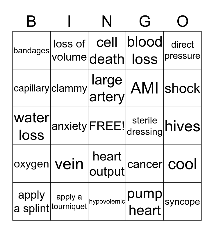 This bingo card has a free space and 24 words: vein, apply a tourniquet, large artery, apply a splint, direct pressure, bandages, capillary, loss of volume, sterile dressing, heart output, AMI, water loss, cancer, cool, clammy, pump heart, hives, cell death, shock, anxiety, syncope, oxygen, blood loss and hypovolemic.
