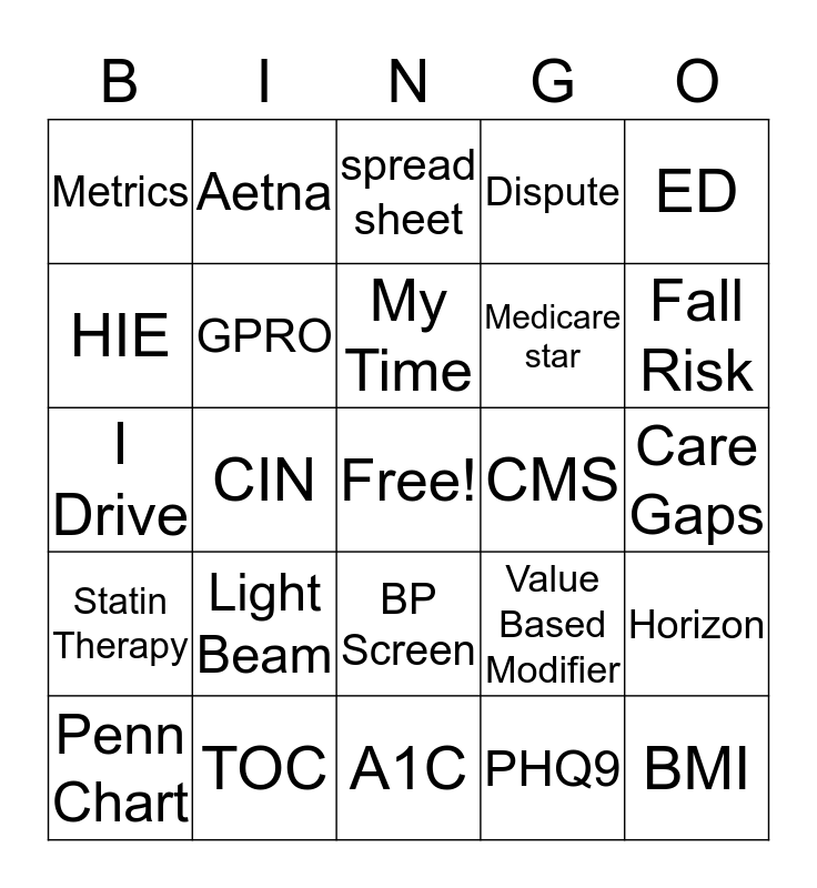 This bingo card has a free space and 29 words: Penn Chart, ACO, CIN, SNF, Metrics, spread sheet, GPRO, Light Beam, CMS, TOC, Care Gaps, BMI, A1C, PHQ9, Fall Risk, Influenza, BP Screen, Statin Therapy, ED, I Drive, Value Based Modifier, Bundles, Medicare star, HIE, Dispute, Aetna, Horizon, My Time and Cohort.