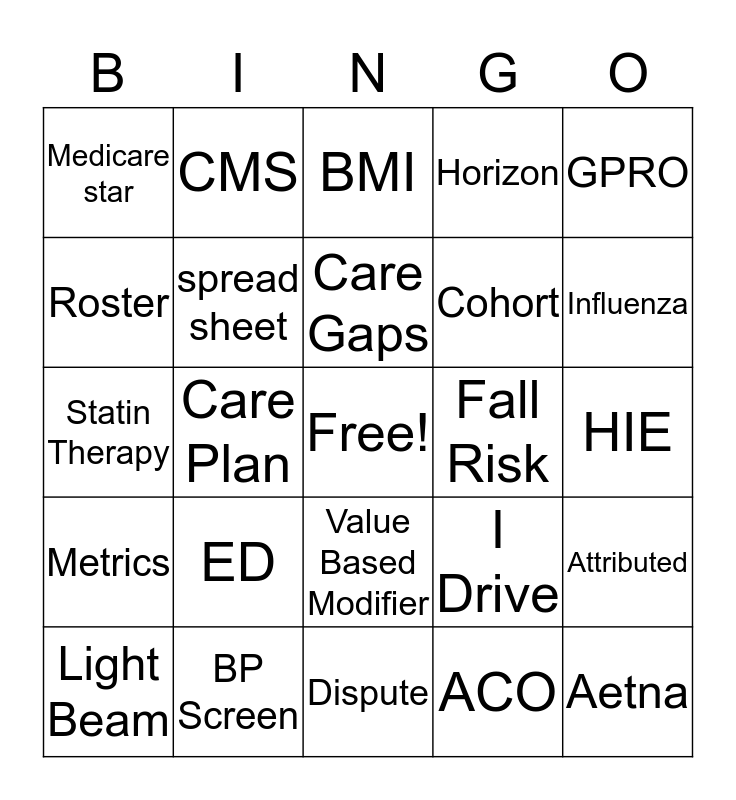 This bingo card has a free space and 34 words: Penn Chart, ACO, CIN, SNF, Metrics, spread sheet, GPRO, Light Beam, CMS, TOC, Care Gaps, BMI, A1C, PHQ9, Fall Risk, Influenza, BP Screen, Statin Therapy, ED, I Drive, Value Based Modifier, Bundles, Medicare star, HIE, Dispute, Aetna, Horizon, My Time, Cohort, Roster, Minutes, Care Plan, Attributed and Risk factors.