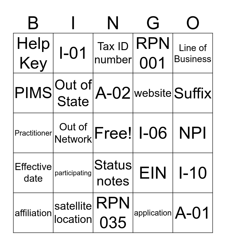This bingo card has a free space and 28 words: I-10, Tracking Tool, website, application, PIMS, Tax ID number, I-01, Effective date, I-06, affiliation, Practitioner, RPN 001, satellite location, RPN 035, Suffix, SSN, participating, Out of State, A-02, Status notes, Help Key, missing document, A-01, Out of Network, NPI, EIN, Line of Business and credentialing.