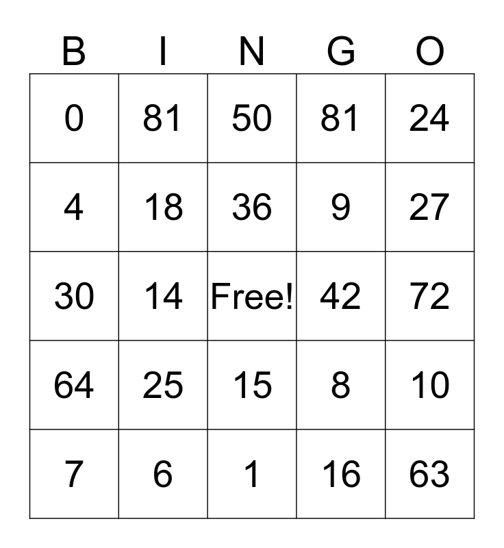 This bingo card has a free space and 24 words: 25, 6, 36, 7, 24, 0, 4, 81, 42, 15, 9, 30, 8, 10, 18, 16, 72, 50, 27, 14, 63, 64, 81 and 1.