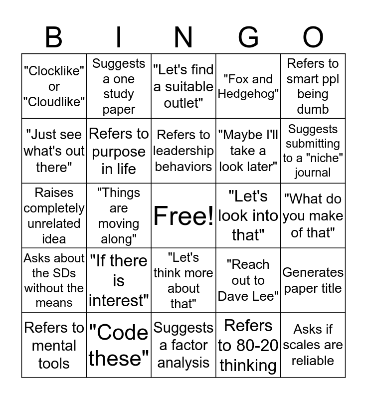 This bingo card has a free space and 24 words: "If there is interest", "Code these", Refers to leadership behaviors, Refers to mental tools, Refers to smart ppl being dumb, "Clocklike" or "Cloudlike", "Just see what's out there", Suggests a one study paper, "Let's look into that", "Let's think more about that", "Maybe I'll take a look later", Raises completely unrelated idea, "Reach out to Dave Lee", Generates paper title, Refers to purpose in life, Refers to 80-20 thinking, "What do you make of that", "Let's find a suitable outlet", Suggests submitting to a "niche" journal, "Things are moving along", Asks if scales are reliable, Asks about the SDs without the means, "Fox and Hedgehog" and Suggests a factor analysis.