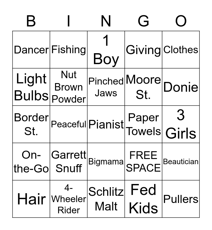 This bingo card has 25 words: Garrett Snuff, Schlitz Malt, Pinched Jaws, Hair, Clothes, Dancer, Light Bulbs, Fishing, Paper Towels, Bigmama, Moore St., Border St., FREE SPACE, Beautician, Nut Brown Powder, Pullers, 3 Girls, 1 Boy, Donie, Peaceful, Pianist, 4-Wheeler Rider, On-the-Go, Giving and Fed Kids.