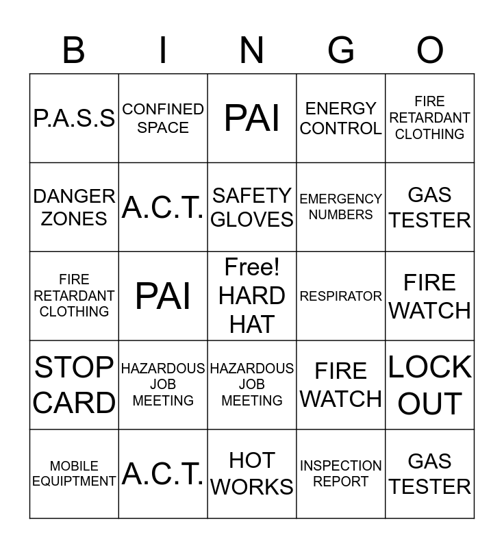 This bingo card has a free space and 49 words: PPE, GAS TESTER, MOBILE EQUIPTMENT, HOT WORKS, HAZARDOUS JOB MEETING, STOP CARD, CONFINED SPACE, HARNESS, DANGER ZONES, DISTRACTIONS, A.C.T., ENERGY CONTROL, LOCK OUT, FIRE WATCH, ECPS, TRIPS SLIPS FALLS, SAFETY GLOVES, RESPIRATOR, SJP'S, FIRE RETARDANT CLOTHING, PAI, INSPECTION REPORT, P.A.S.S, EMERGENCY NUMBERS, PPE, GAS TESTER, MOBILE EQUIPTMENT, HOT WORK, HAZARDOUS JOB MEETING, STOP CARD, CONFINED SPACE, HARNESS, DANGER ZONES, DISTRACTIONS, A.C.T., ENERGY CONTROL, FREE HARD HAT, LOCK OUT, FIRE WATCH, ECP'S, TRIPS SLIPS FALLS, SAFETY GLOVES, RESPIRATOR, SJP'S, FIRE RETARDANT CLOTHING, PAI, INSPECTION REPORT, P.A.S.S. and EMERGENCY NUMBERS.