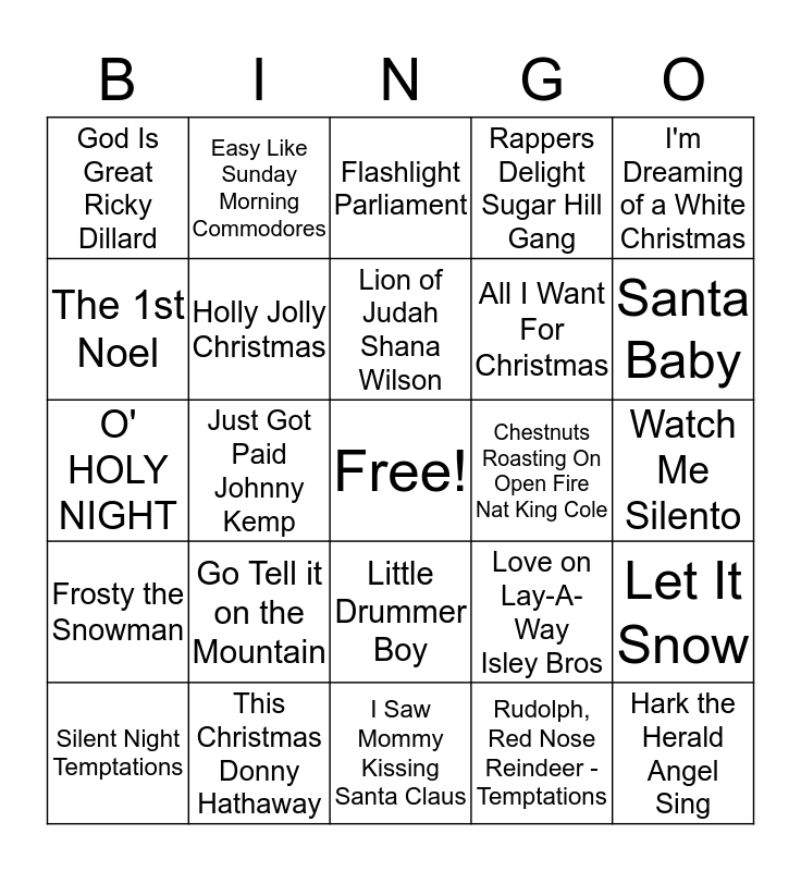 This bingo card has a free space and 24 words: Go Tell it on the Mountain, This Christmas Donny Hathaway, Lion of Judah Shana Wilson, Silent Night Temptations, I'm Dreaming of a White Christmas, God Is Great Ricky Dillard, The 1st Noel, Easy Like Sunday Morning Commodores, Chestnuts Roasting On Open Fire Nat King Cole, Little Drummer Boy, All I Want For Christmas, O' HOLY NIGHT, Love on Lay-A-Way Isley Bros, Let It Snow, Holly Jolly Christmas, Rudolph, Red Nose Reindeer -Temptations, Watch Me Silento, Flashlight Parliament, Santa Baby, Just Got Paid Johnny Kemp, Hark the Herald Angel Sing, Frosty the Snowman, Rappers Delight Sugar Hill Gang and I Saw Mommy Kissing Santa Claus.