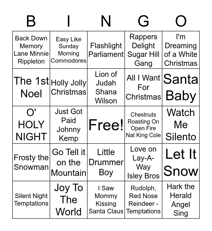 This bingo card has a free space and 24 words: Go Tell it on the Mountain, Joy To The World, Lion of Judah Shana Wilson, Silent Night Temptations, I'm Dreaming of a White Christmas, Back Down Memory Lane Minnie Rippleton, The 1st Noel, Easy Like Sunday Morning Commodores, Chestnuts Roasting On Open Fire Nat King Cole, Little Drummer Boy, All I Want For Christmas, O' HOLY NIGHT, Love on Lay-A-Way Isley Bros, Let It Snow, Holly Jolly Christmas, Rudolph, Red Nose Reindeer -Temptations, Watch Me Silento, Flashlight Parliament, Santa Baby, Just Got Paid Johnny Kemp, Hark the Herald Angel Sing, Frosty the Snowman, Rappers Delight Sugar Hill Gang and I Saw Mommy Kissing Santa Claus.