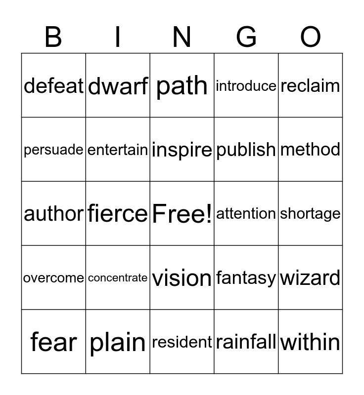 This bingo card has a free space and 29 words: fear, respect, fierce, update, defeat, path, entertain, concentrate, attention, plain, shortage, within, resident, rainfall, method, root, vision, overcome, reclaim, author, fantasy, professor, publish, persuade, introduce, dwarf, wizard, inspire and battle.