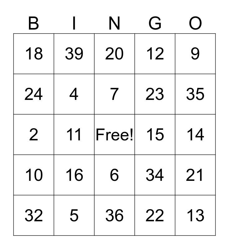 This bingo card has a free space and 40 words: 1, 2, 3, 4, 5, 6, 7, 8, 9, 10, 11, 12, 13, 14, 15, 16, 17, 18, 19, 20, 21, 22, 23, 24, 25, 26, 27, 28, 29, 30, 31, 32, 33, 34, 35, 36, 37, 38, 39 and 40.