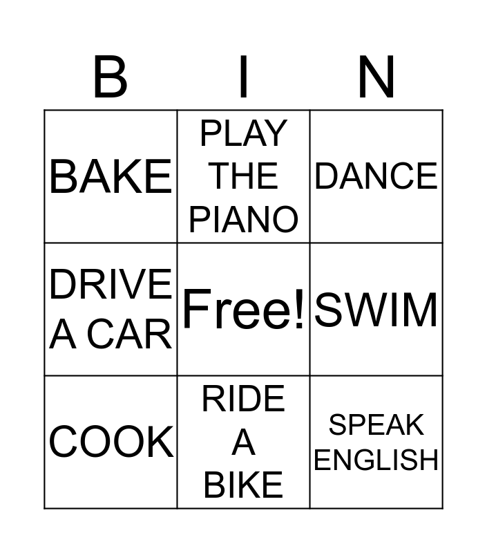 This bingo card has a free space and 8 words: SWIM, DANCE, PLAY THE PIANO, COOK, BAKE, SPEAK ENGLISH, DRIVE A CAR and RIDE A BIKE.