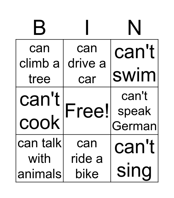 This bingo card has a free space and 8 words: can't speak German, can't swim, can drive a car, can talk with animals, can climb a tree, can't sing, can't cook and can ride a bike.