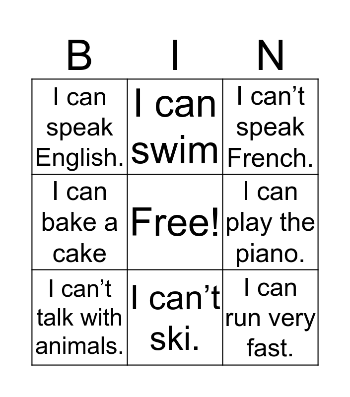 This bingo card has a free space and 8 words: I can play the piano., I can’t speak French., I can swim, I can’t talk with animals., I can speak English., I can run very fast., I can bake a cake and I can’t ski..