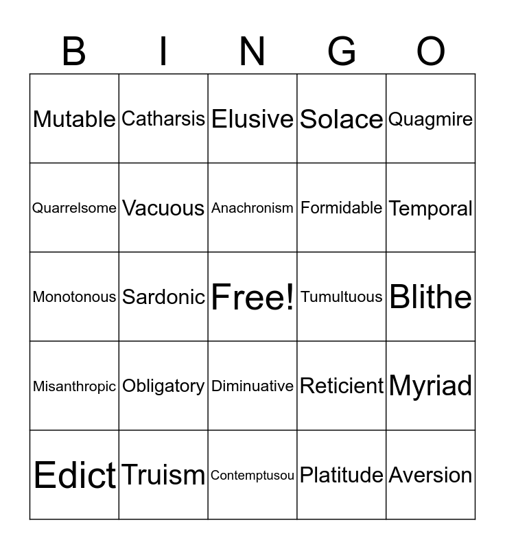 This bingo card has a free space and 39 words: AUdacious, Pious, Decorum, Vacuous, Edict, Diminuative, Anachronism, Futile, Quagmire, Misanthropic, Sardonic, Solace, Aversion, Blithe, Tumultuous, Obligatory, Superfluous, Mutable, Visage, Reticient, Quarrelsome, Contemptusou, Formidable, Temporal, Indifference, Debacle, Magnanimity, Abidcate, Insatiable, Catharsis, Zeal, Volition, Elusive, Truism, Platitude, Banter, Myriad, Monotonous and Censure.