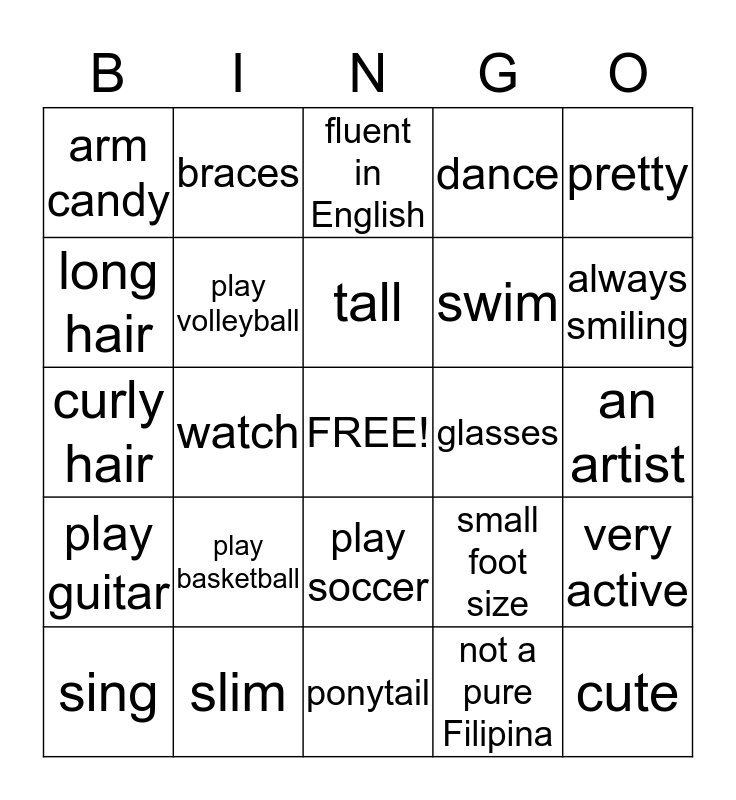 This bingo card has a free space and 24 words: play basketball, slim, tall, sing, pretty, arm candy, long hair, braces, glasses, play soccer, swim, curly hair, small foot size, very active, play volleyball, not a pure Filipina, an artist, fluent in English, always smiling, watch, cute, play guitar, dance and ponytail.